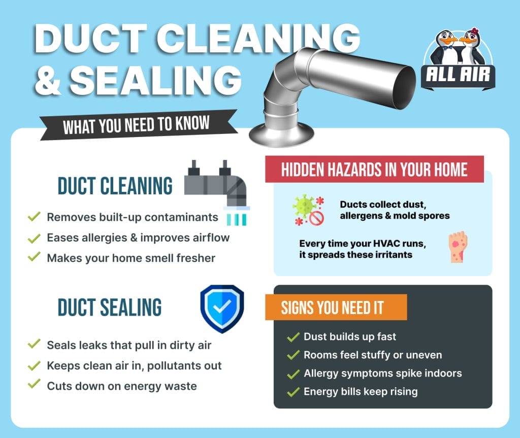 The investment you make in professional duct cleaning and sealing comes back to you in so many wonderful ways: fewer allergy struggles, lower energy bills, a longer-lasting HVAC system, and most importantly, the wonderful peace of mind that comes with knowing your family is breathing the cleanest air possible.